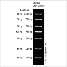 The DL15000 DNA Ladder is a ready-to-use DNA ladder, which is pre-mixed with loading dye for direct loading on gel. The DNA ladder is composed of 7 individual DNA fragments: 15,000 bp, 10,000 bp, 7,500 bp, 5,000 bp, 2,500 bp, 1,000 bp, 250 bp derived from a mixture of PCR products and specifically digested plasmid DNA.